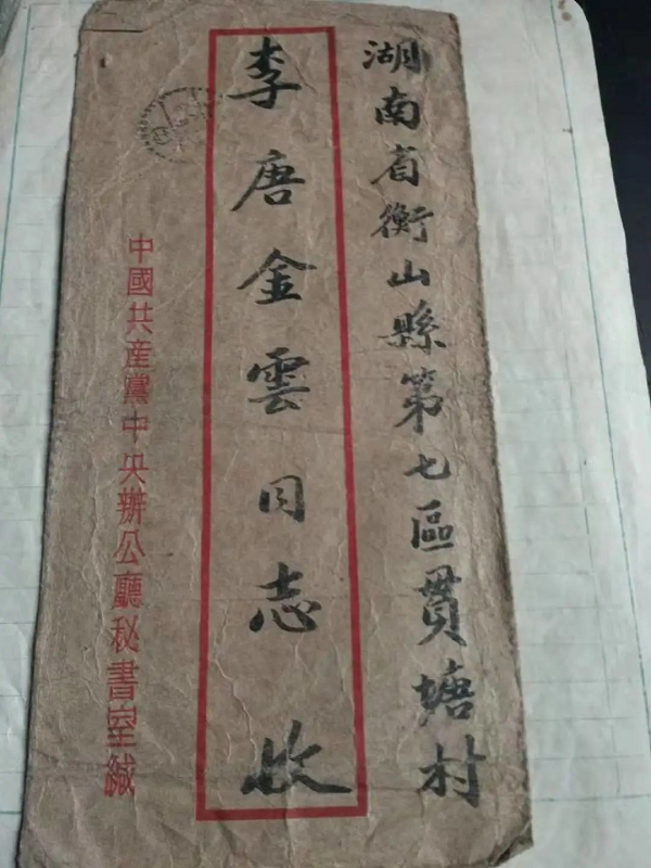 1950年8月14日中共中央辦公廳給李實行烈士遺孀唐金云回信的信封