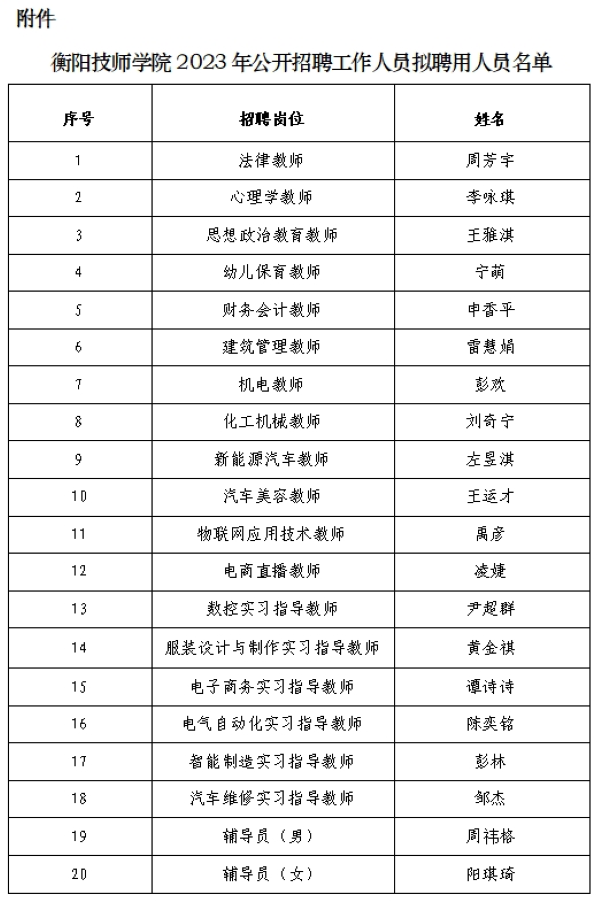 附件:衡陽(yáng)技師學(xué)院2023年公開(kāi)招聘工作人員擬聘用人員名單