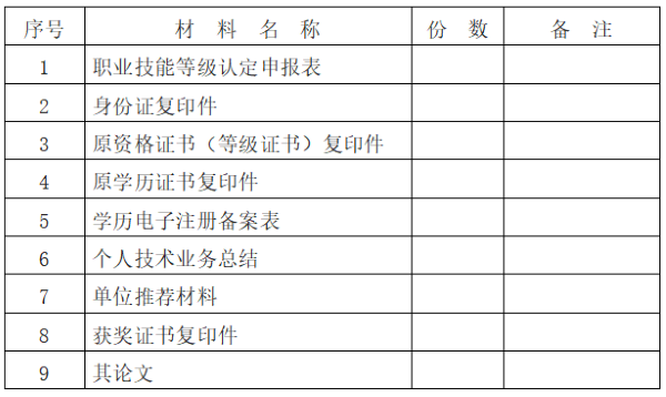 1.《湖南省職業(yè)技能等級(jí)認(rèn)定個(gè)人申報(bào)表》(從附件下載)