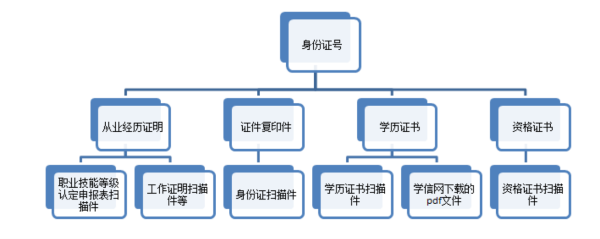 (3)將職業(yè)技能等級(jí)認(rèn)定申報(bào)表掃描件、工作證明掃描件及社保證明(圖片大小小于5MB)存放在子文件夾“從業(yè)經(jīng)歷證明”下;學(xué)歷證書掃描件、學(xué)信網(wǎng)下載的pdf文件放在子文件夾“學(xué)歷證書”下;等級(jí)證書或資格證書掃描件放在子文件夾“資格證書”下,身份證掃描件存放在子文件夾“證件復(fù)印件“下,掃描件都是指以jpg格式保存的。