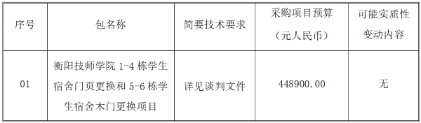 衡陽技師學院的1-4棟學生宿舍門頁更換和5-6棟學生宿舍木門更換項目 進行競爭性談判采購,現采用發布公告方式,邀請符合資格條件的供應商提交證明材料參與資格審查活動。