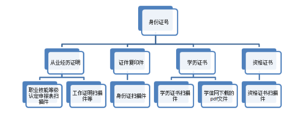 (3)將職業技能等級認定申報表掃描件、工作證明掃描件(圖片大小小于5MB)存放在子文件夾“從業經歷證明”下;學歷證書掃描件、學信網下載的pdf文件放在子文件夾“學歷證書”下;資格證書掃描件放在子文件夾“資格證書”下,身份證掃描件存放在子文件夾“證件復印件“下,掃描件都是指以jpg格式保存的。