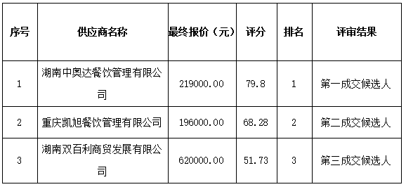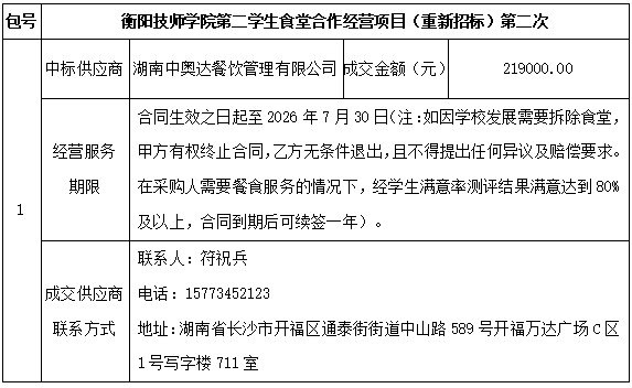 衡陽技師學院的衡陽技師學院第二學生食堂合作經營項目(重新招標)第二次競爭性磋商采購于2023年9月30日結束,現將成交結果公告如下: