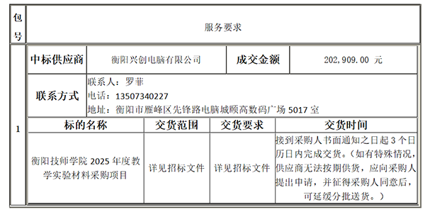 衡陽技師學(xué)院2025年度教學(xué)實驗材料采購項目公開招標(biāo)采購項目于2025年01月20日結(jié)束,現(xiàn)將中標(biāo)(成交)結(jié)果公告如下: