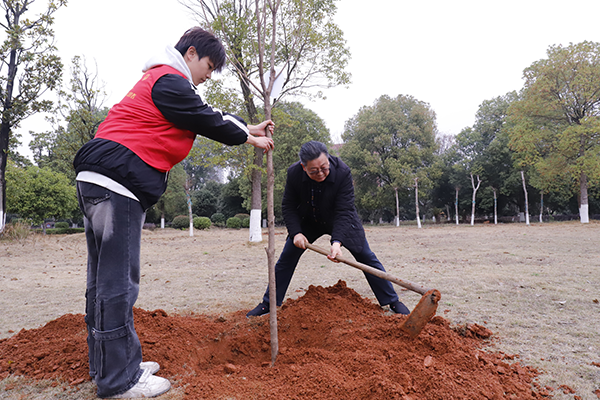 枝頭生機初現(xiàn),泥土散發(fā)清香。挖坑、放樹、覆土、澆水……學院北斗園一派忙碌的植樹景象。大家隨后把“愛心護樹牌”掛在樹枝上,傳遞著一份份環(huán)保責任。一棵棵新栽的金桂樹苗扎根沃土,為校園植下一抹抹新綠。