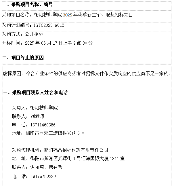 衡陽技師學院2025年秋季新生軍訓服裝招標項目 廢標公告