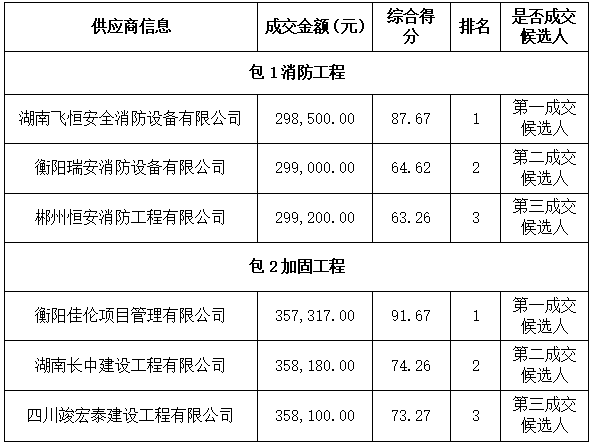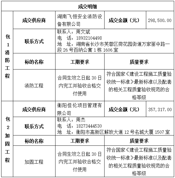 衡陽技師學院不動產權證辦理配套消防工程及加固工程項目于2025年7月29日結束,現將成交結果公告如下: