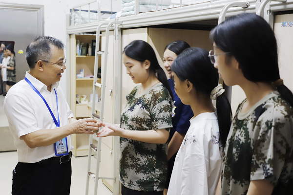 “同學們,軍訓累不累?還適應嗎?”“最近休息還好嗎?”“對學院的宿舍和食堂還滿意嗎?”肖春林一行深入學生宿舍,向同學們詢問軍訓感受和身體情況,一句句暖心的關心與問候輕輕撫慰著同學們的內心。