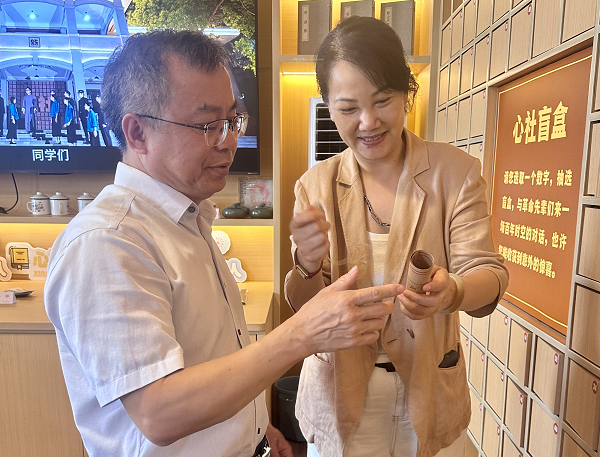 走進“心社”展示陳列區,大家沉浸式體驗百年前“心社”熱血澎湃的紅色記憶。在《政治生日憶初心》微黨課體驗環節中,“砍頭不要緊,只要主義真”的鏗鏘誓言在書屋內回蕩。“請您選取一個數字,抽取對應的盲盒,與革命前輩來一場跨越時空的對話?!斌w驗者打開一個盲盒,落款是“心社”成員、革命烈士賀恕。