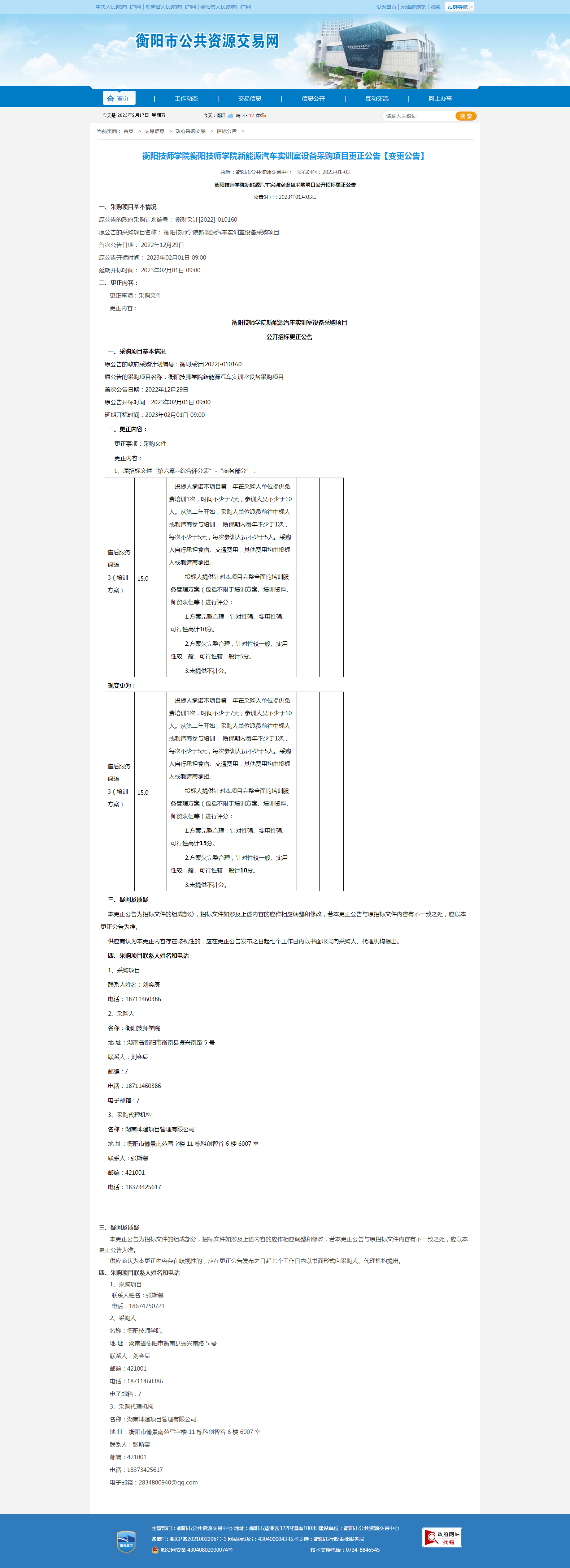 衡陽技師學院衡陽技師學院新能源汽車實訓室設備采購項目更正公告【變更公告】