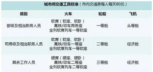 | 交通工具級別 | 火車(含高鐵、動車、全列軟席列車) | 輪船(不包括旅游船) | 飛機 | 其他交通工具(不包括出租小汽車) |