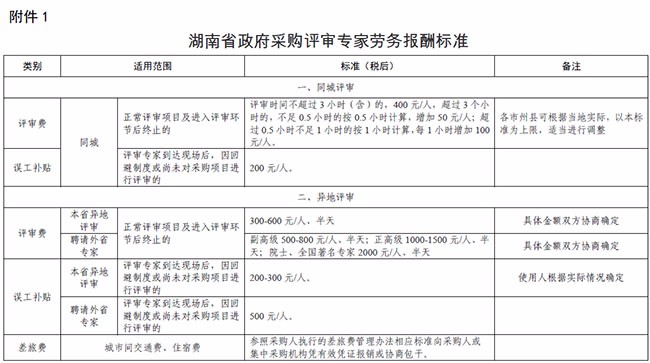 附件:1、湖南省政府采購項目評審專家勞務(wù)報酬標(biāo)準(zhǔn)