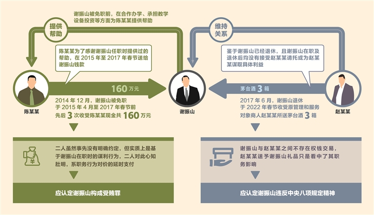 趙春玲:經查,謝振山被免職后,于2015年4月至2017年春節前,先后3次收受陳某某現金共160萬元;謝振山退休后,于2022年春節收受原管理和服務對象商人趙某某所送茅臺酒3箱。因上述行為發生在謝振山退出領導崗位后,我們著重從謝振山與二人的平日交往、有無經濟往來、收受時間、往來緣由、是否有謀利事項等方面收集固定證據。最終查明,160萬元系陳某某為感謝謝振山在任時提供的幫助而送,應認定謝振山收受160萬元的行為構成受賄罪;謝振山在退休后收受趙某某為了維持關系而送的茅臺酒,應認定為違反中央八項規定精神。