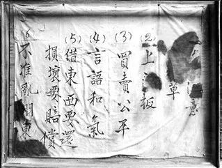 在井岡山革命博物館里,珍藏著一塊灰白色的方粗布,長87厘米,寬81厘米,上面寫著:(1)捆鋪草;(2)上門板;(3)買賣公平;(4)言語和氣;(5)借東西要還,損壞要賠償;(6)不準亂翻東西。