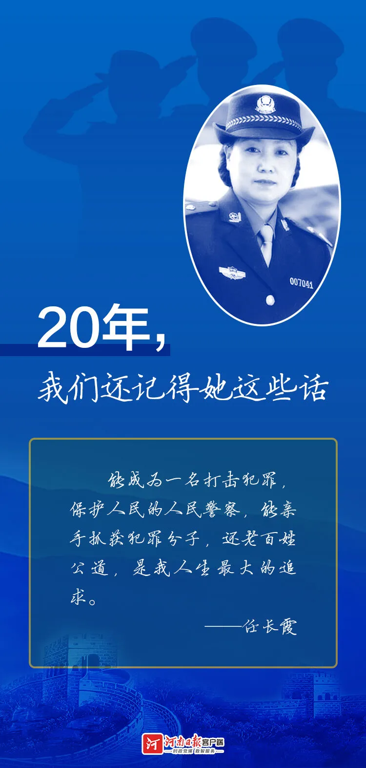 任長霞有句名言——“我認為警察就是我的天職,為自己所執著追求的事業而獻身,值!”這句話也激勵著一代代河南公安干警在忠實踐行對黨忠誠、服務人民、執法公正、紀律嚴明總要求的道路上勇往直前,為建設更高水平的平安河南法治河南貢獻力量。