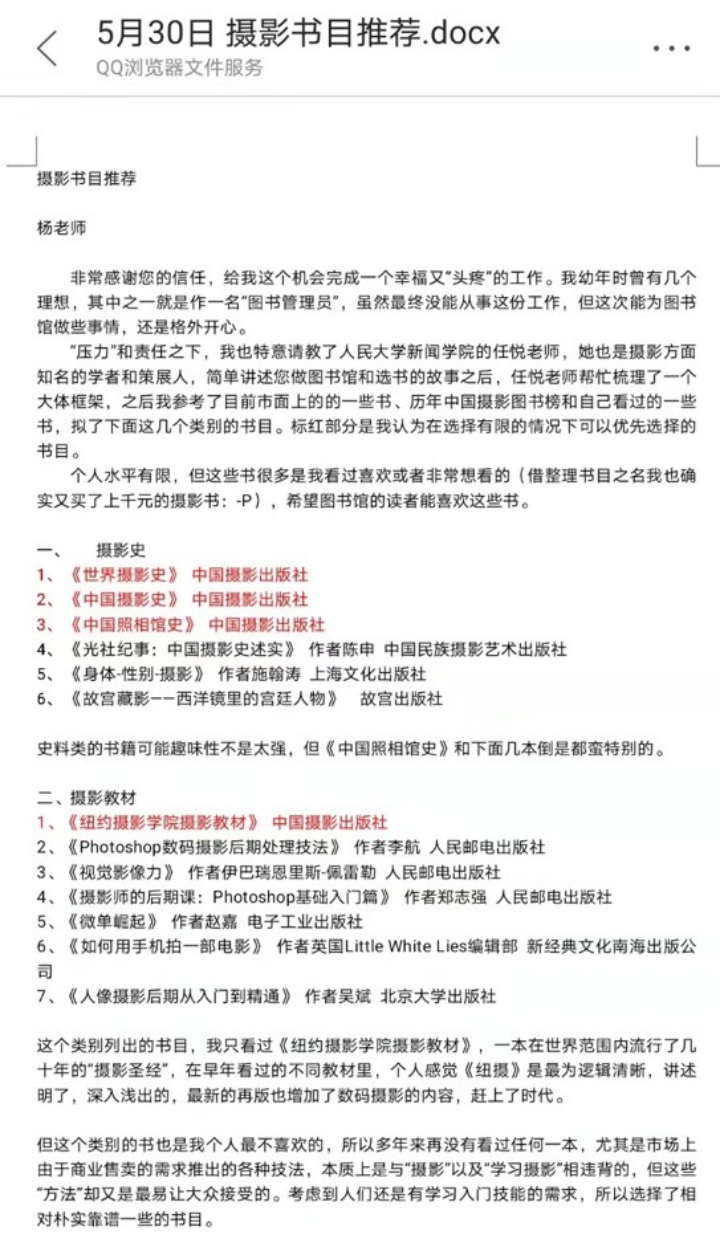 這是一位攝影師宋璐給我發(fā)來的書單。這封信長達5000字,里面用紅色和黑色區(qū)別了書的重要程度,然后又詳細地給我解釋了他推薦每一本書的理由。這封長長的信也讓我很感動。