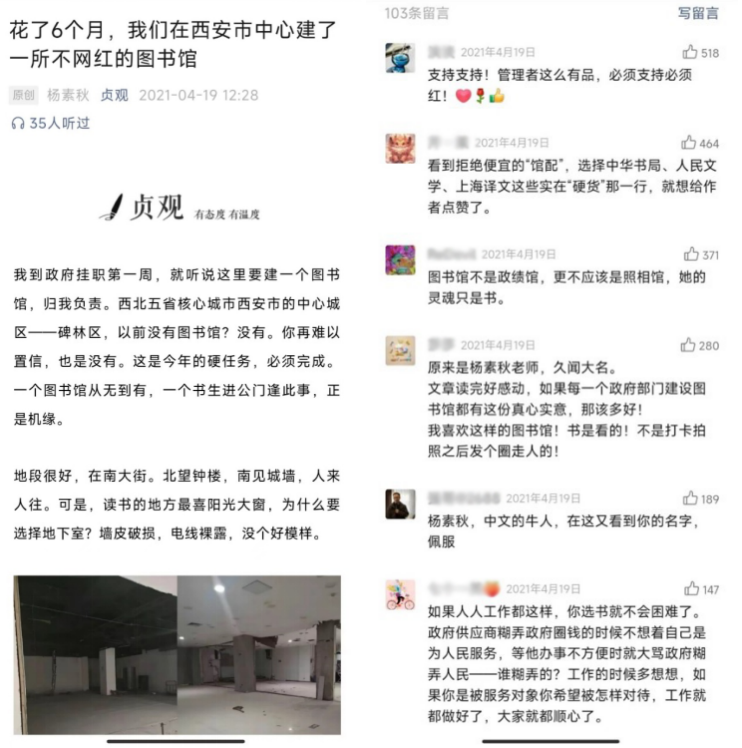 這篇文章我投稿給西安本地的一個公眾號“貞觀”,文章的名字叫做《花了6個月,我們在西安市中心建了一所不網(wǎng)紅的圖書館》。這篇文章的閱讀量很快到了6萬,比這個公眾號平常的閱讀量要高得多。我不停地翻閱評論區(qū),2分鐘就刷一下,特別開心。