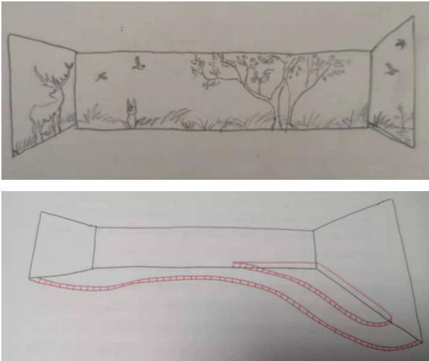 以及當(dāng)年我們因為資金緊張,沒錢請設(shè)計師,所以是我用鉛筆畫了一幅兒童區(qū)的草圖,畫得很丑,連透視法都是錯的。大家看那個兔子,畫得好像狗一樣。我把這張圖也放了進來。