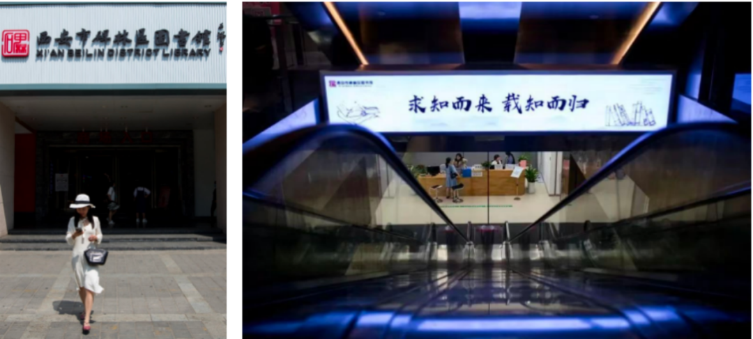 左邊是圖書館的門頭,大家可以看到,不太大。右邊是圖書館往地下走的扶梯。大家可能會納悶,圖書館怎么會建在地下呢?當(dāng)初接到這個任務(wù)的時候,我也很納悶。