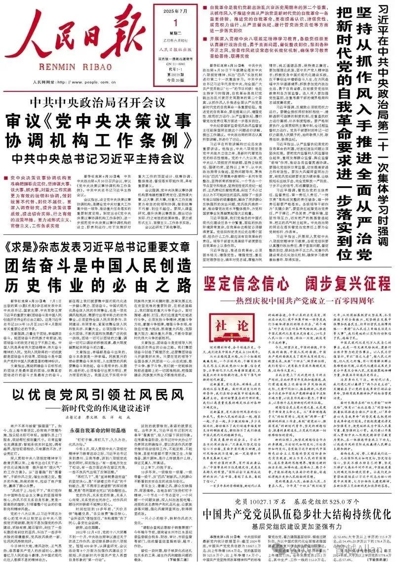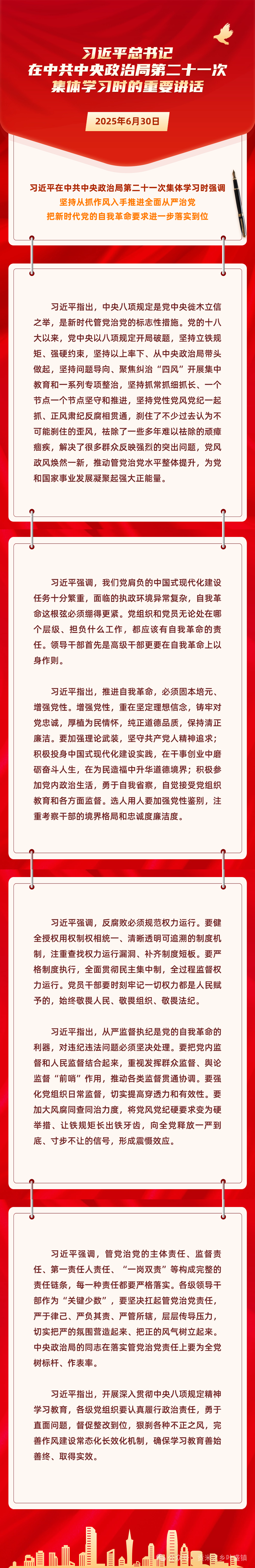 中共中央政治局6月30日下午就健全落實(shí)中央八項(xiàng)規(guī)定精神、糾治“四風(fēng)”長(zhǎng)效機(jī)制進(jìn)行第二十一次集體學(xué)習(xí)。中共中央總書記習(xí)近平代表黨中央,向全國(guó)廣大共產(chǎn)黨員致以“七一”的節(jié)日問候!他在主持學(xué)習(xí)時(shí)強(qiáng)調(diào),自我革命是我們黨跳出治亂興衰歷史周期率的第二個(gè)答案,從抓作風(fēng)入手推進(jìn)全面從嚴(yán)治黨是新時(shí)代黨的自我革命一條重要經(jīng)驗(yàn)。推進(jìn)黨的自我革命,要在提高認(rèn)識(shí)、增強(qiáng)黨性、規(guī)范權(quán)力運(yùn)行、從嚴(yán)監(jiān)督執(zhí)紀(jì)、履行管黨治黨責(zé)任等方面進(jìn)一步落實(shí)到位。