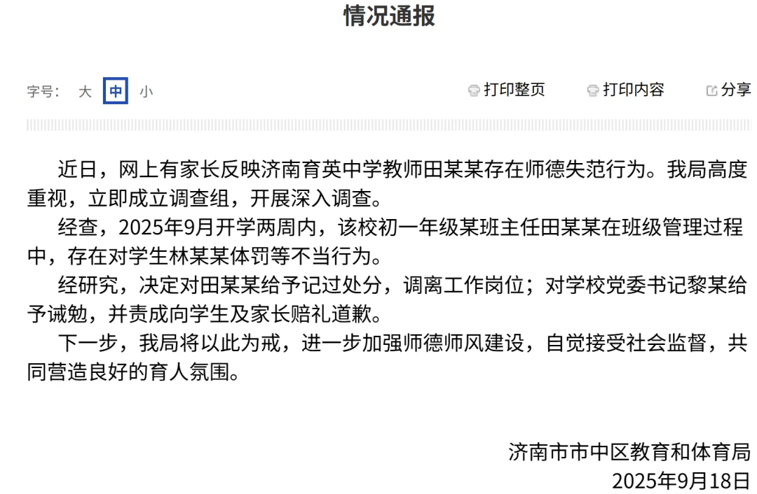 近日,網(wǎng)上有家長(zhǎng)反映濟(jì)南育英中學(xué)教師田某某存在師德失范行為。我局高度重視,立即成立調(diào)查組,開展深入調(diào)查。