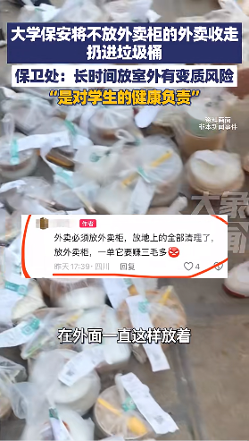 9月17日,我們關注到我校保安將未放柜外賣扔垃圾桶相關事件,對于保安人員在管理過程中的簡單、粗暴行為給學生造成了損失,我們表示深深的歉意。學校立即啟動對受損學生外賣補償的工作。下一步,學校將逐級調查核實,對相關部門及工作人員進行追責處理。