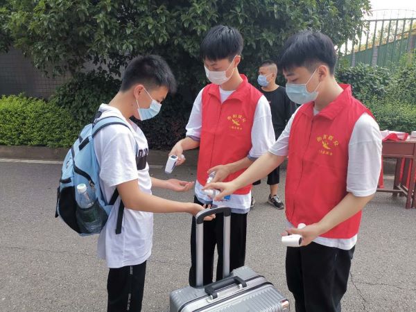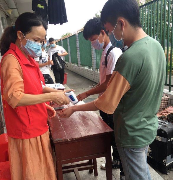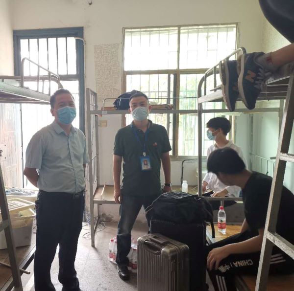 在男生宿舍1棟,參與志愿服務(wù)活動(dòng)的教師對(duì)返校同學(xué)進(jìn)行體溫檢測(cè)及消毒,查看并勸導(dǎo)學(xué)生戴好口罩,不串門,搞好宿舍及個(gè)人衛(wèi)生,確保返校師生的安全和健康。