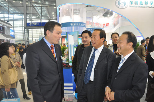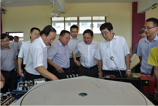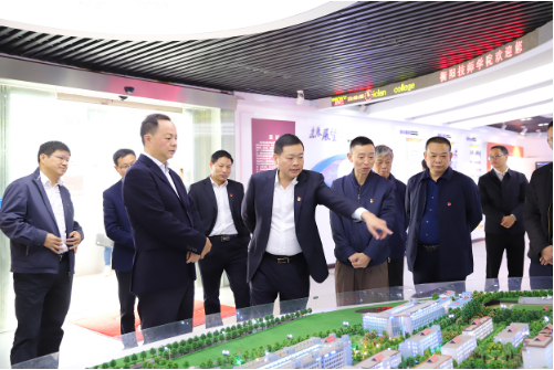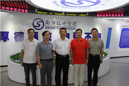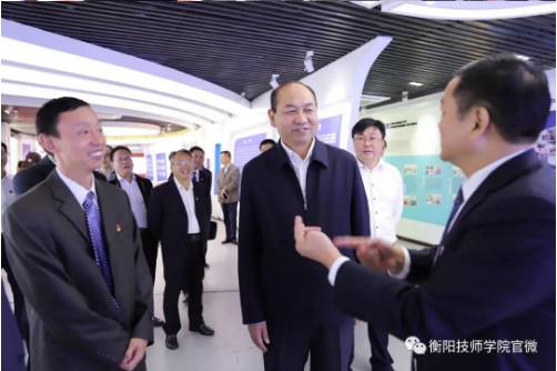 在衡陽技師學院院長吳瑞祥(左二)的陪同下視察衡陽技師學院展區