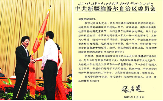 時任新疆維吾爾自治區黨委書記張春賢為在我院學習的新疆學員授旗并致慰問信