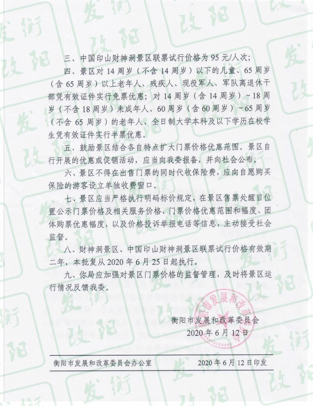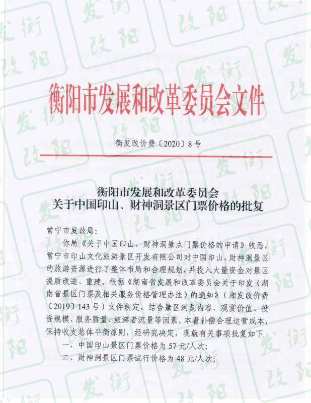 衡陽市發展和改革委員會關于中國印山、財神洞景區門票價格的批復
