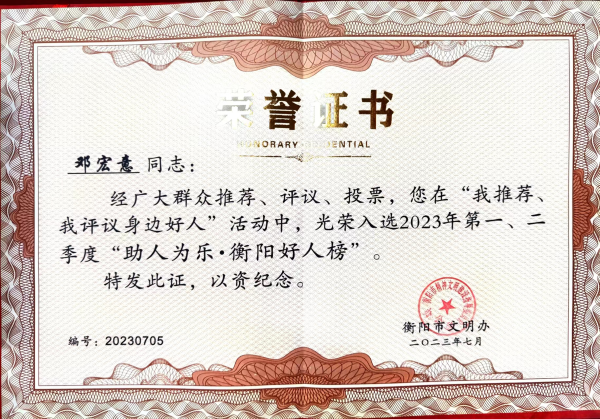 光榮入選2023年第一、二季度“助人為樂(lè)·衡陽(yáng)好人榜”