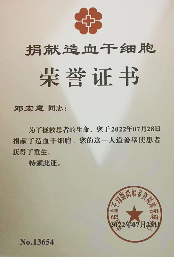 鄧宏意于2021年5月加入中國(guó)造血干細(xì)胞捐獻(xiàn)者資料庫(kù)管理中心,2022年5月與杭州的一名患者匹配成功。捐獻(xiàn)造血干細(xì)胞對(duì)于一般人來(lái)說(shuō)并不是一件小事,但當(dāng)管理中心工作人員找到他時(shí),他卻同意捐獻(xiàn)。2022年6月,鄧宏意體檢順利通過(guò),2022年7月,他成功捐獻(xiàn)了造血干細(xì)胞,為患者點(diǎn)燃了生命的希望。