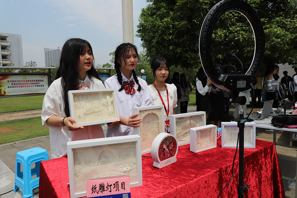“歡迎各位小伙伴們來到我們時(shí)光漫影小店的直播間,今天帶來了我們同學(xué)自己手工制作的光影藝術(shù)燈‘紙雕燈’......”學(xué)院信息與生物技術(shù)系學(xué)生許欣怡、鄭淑芳、曾琪化身“主播”,現(xiàn)場直播介紹紙雕燈項(xiàng)目,吸引不少初中生在技能特色展示區(qū)駐足圍觀,贏得現(xiàn)場陣陣贊嘆。