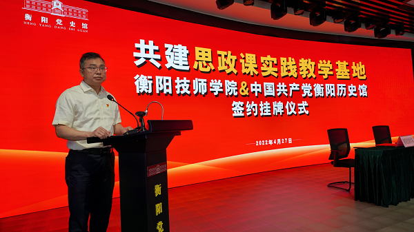 “我們秉持著‘敢于擔(dān)當(dāng)、勇于攻堅(jiān)、善于創(chuàng)新、樂(lè)于奉獻(xiàn)’的建館精神,創(chuàng)造了場(chǎng)館建設(shè)的‘衡陽(yáng)速度’”謝虹簡(jiǎn)要介紹了中國(guó)共產(chǎn)黨衡陽(yáng)歷史館的發(fā)展歷程,并希望以本次思政課實(shí)踐教學(xué)基地建設(shè)為契機(jī),校館雙方加強(qiáng)合作,為傳承紅色基因、講好中國(guó)共產(chǎn)黨衡陽(yáng)歷史故事而共同努力。