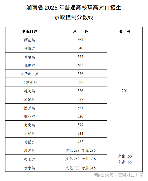 湖南省對口高考2025年本科錄取分數線