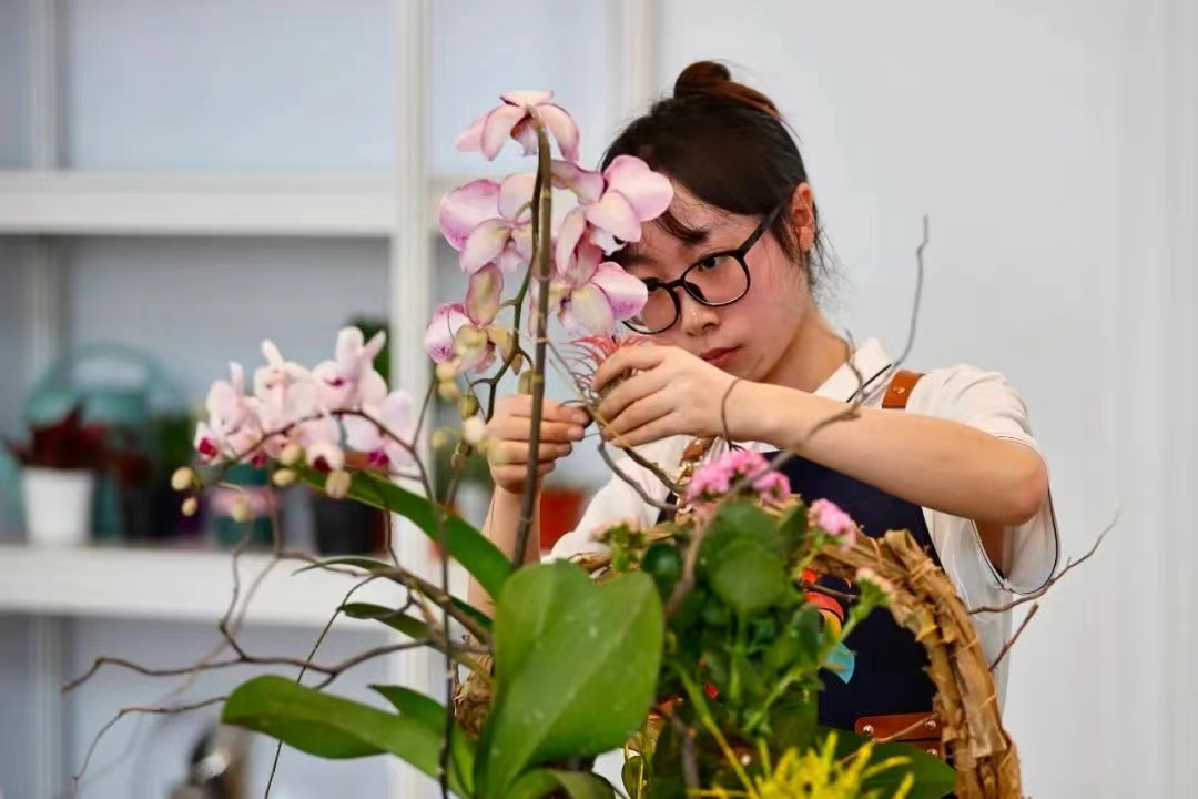 “我希望通過花藝這門藝術來表達我對生活的熱愛”,她善于將花卉的顏色、形狀、紋理等元素巧妙地融入作品中,喜歡運用花語與情感相呼應,創造出富有層次感和韻味的花藝作品,并以此來傳遞溫暖和美好。在比賽中肖娜的作品別具一格,以獨特的設計和構思獲得了評委們的高度評價。
