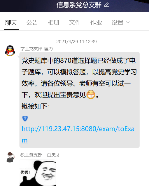在系黨員干部們的號(hào)召下,黨員們積極參加學(xué)院組織的黨史知識(shí)競(jìng)賽,利用課余時(shí)間學(xué)習(xí)黨史知識(shí)、做題庫(kù)的題目;寧婉同志學(xué)習(xí)認(rèn)真刻苦扎實(shí),已做完1000道黨史知識(shí)題目;匡力同志運(yùn)用專(zhuān)業(yè)知識(shí)將題庫(kù)題目做成了電子題庫(kù)小程序,可以模擬答題,以提高黨員們的黨史學(xué)習(xí)成效,更好掌握黨史知識(shí)。